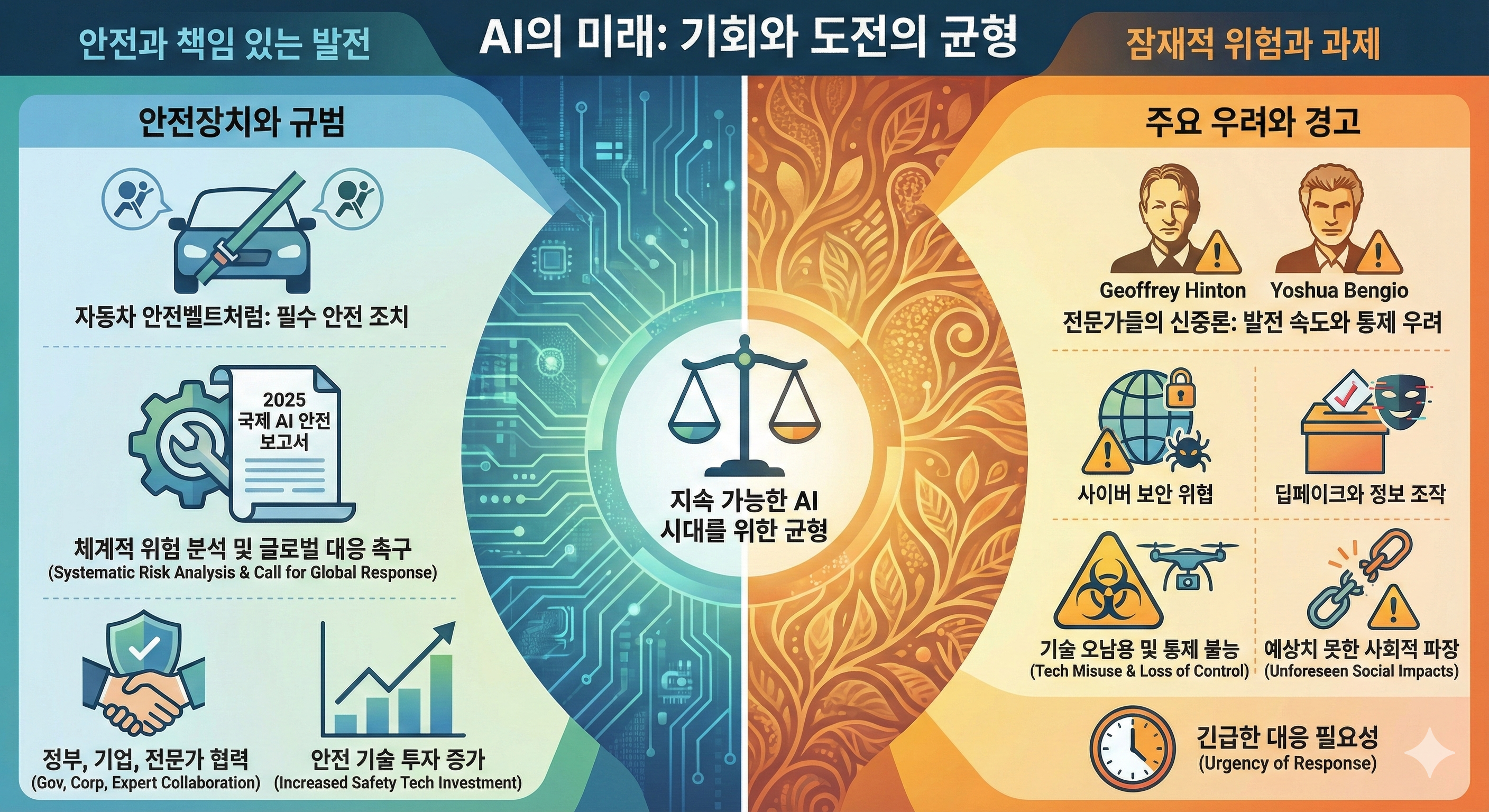물론 이러한 경고가 기술의 발전이나 확산을 막자는 것은 아닙니다. (그랬다면 필자도 이런 가이드를 쓰고 있을리 없겠죠.) 오히려 AI의 혜택을 안전하게 누리기 위해서는 지금부터 충분한 안전장치를 마련해야 한다는게 핵심입니다. 마치 자동차를 발명한 후 안전벨트와 교통법규를 만들었듯이, AI 기술에도 적절한 안전 규범과 제도가 필요한 시점이 빠르게 다가오고 있습니다.