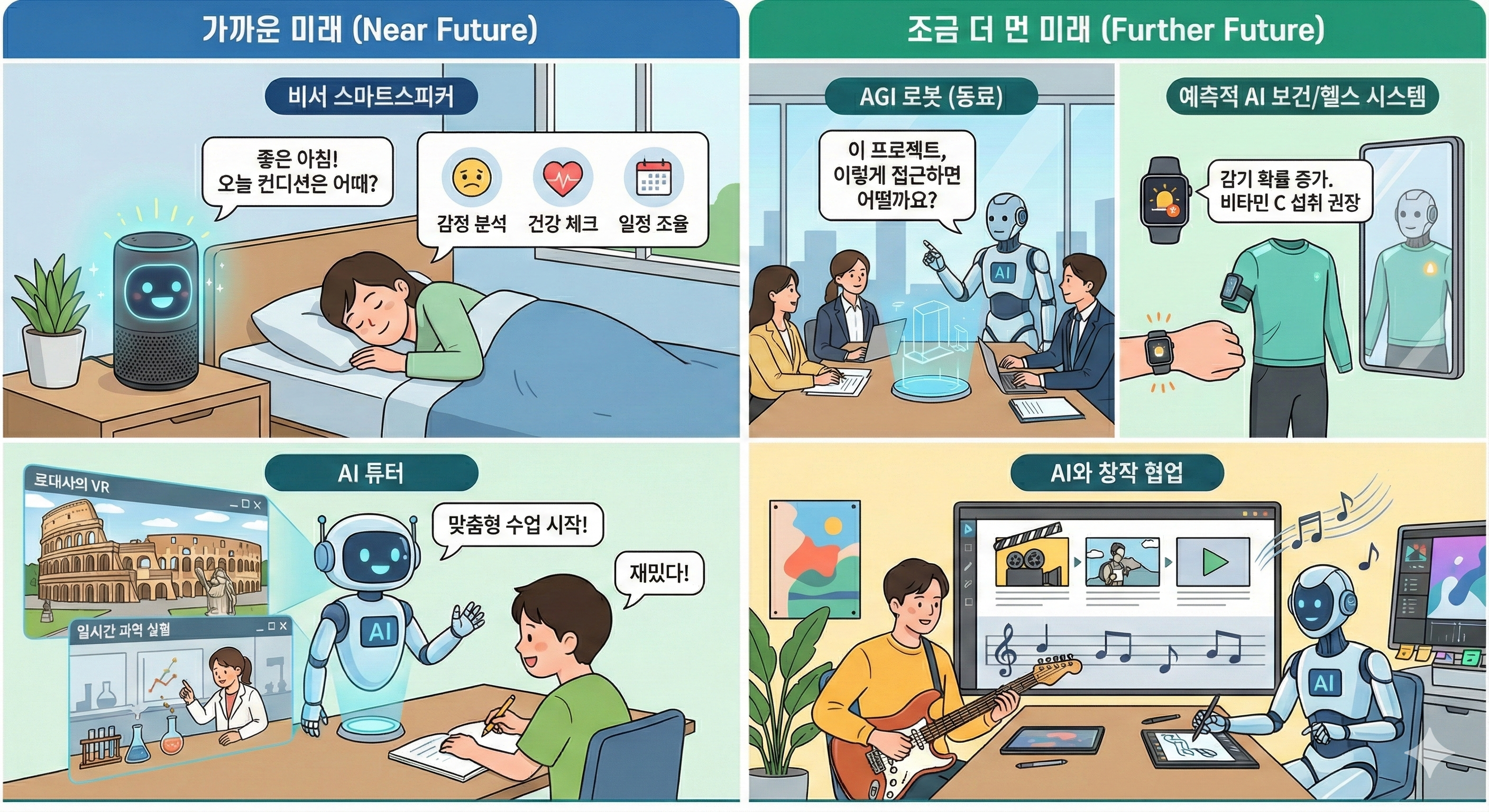머지않아 우리는 아침에 일어나자마자 AI와 대화를 시작하게 될 것입니다. 사용자가 일어났음을 감지한 스마트폰 또는 무언가가 "좋은 아침! 오늘 컨디션은 어때?"라며 말을 걸고, AI는 당신의 대답을 듣고 목소리 톤, 표정, 심지어 움직임까지 분석해 건강 상태를 체크하고 하루 일정을 조율해줄 것입니다. 이미 GPT-5와 Gemini 2.5는 감정을 읽고 공감을 표현하는 수준에 도달했으며, 곧 우울한 날엔 위로를, 기쁜 날엔 축하를 건네는 진짜 친구 같은 AI가 등장할 것입니다.