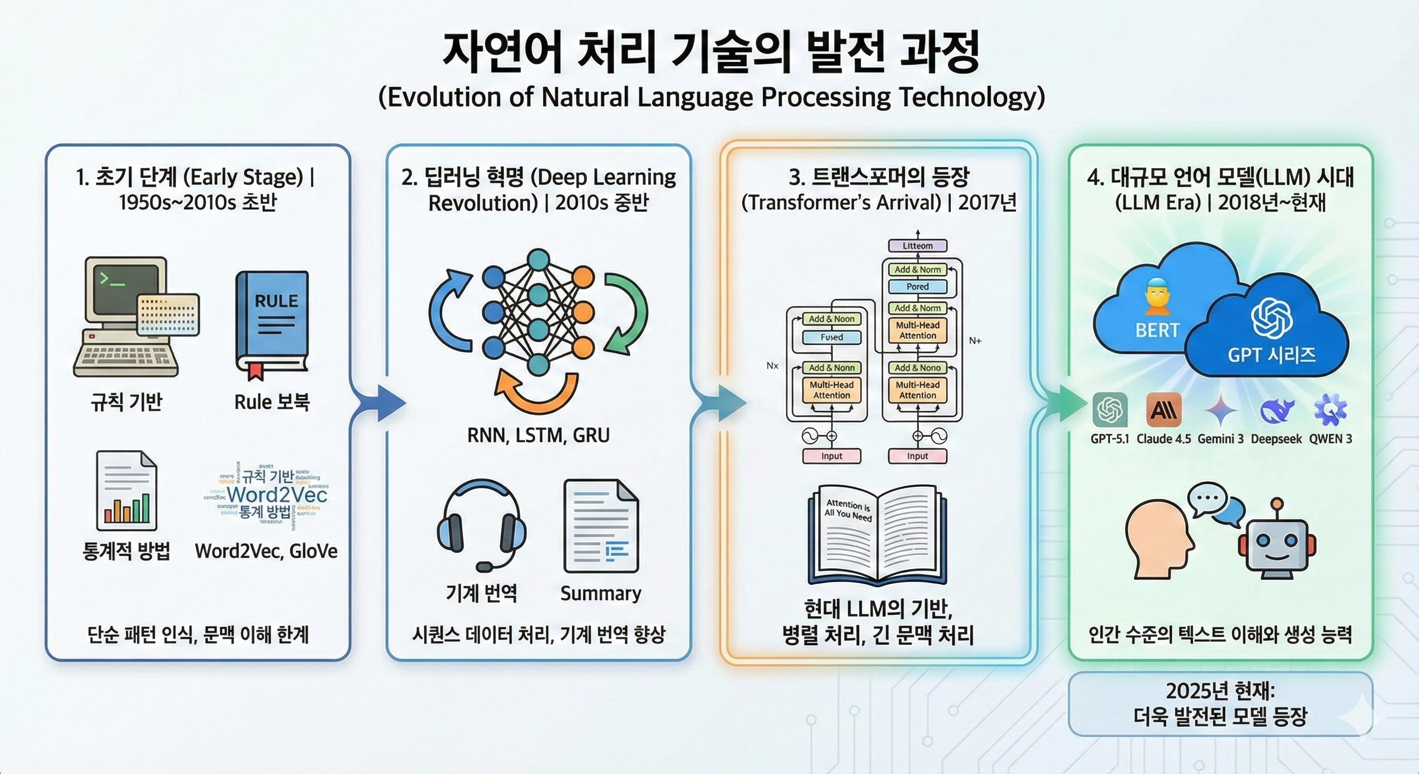 4. 대규모 언어 모델(LLM) 시대 (2018년~현재) BERT, GPT 시리즈를 시작으로 대규모 사전학습 모델이 등장했고, 2025년 현재는 GPT-5.1, Claude 4.5, Gemini 3, Deepseek, QWEN 3 등 더욱 발전된 모델들이 인간 수준의 텍스트 이해와 생성 능력을 보여주고 있습니다.