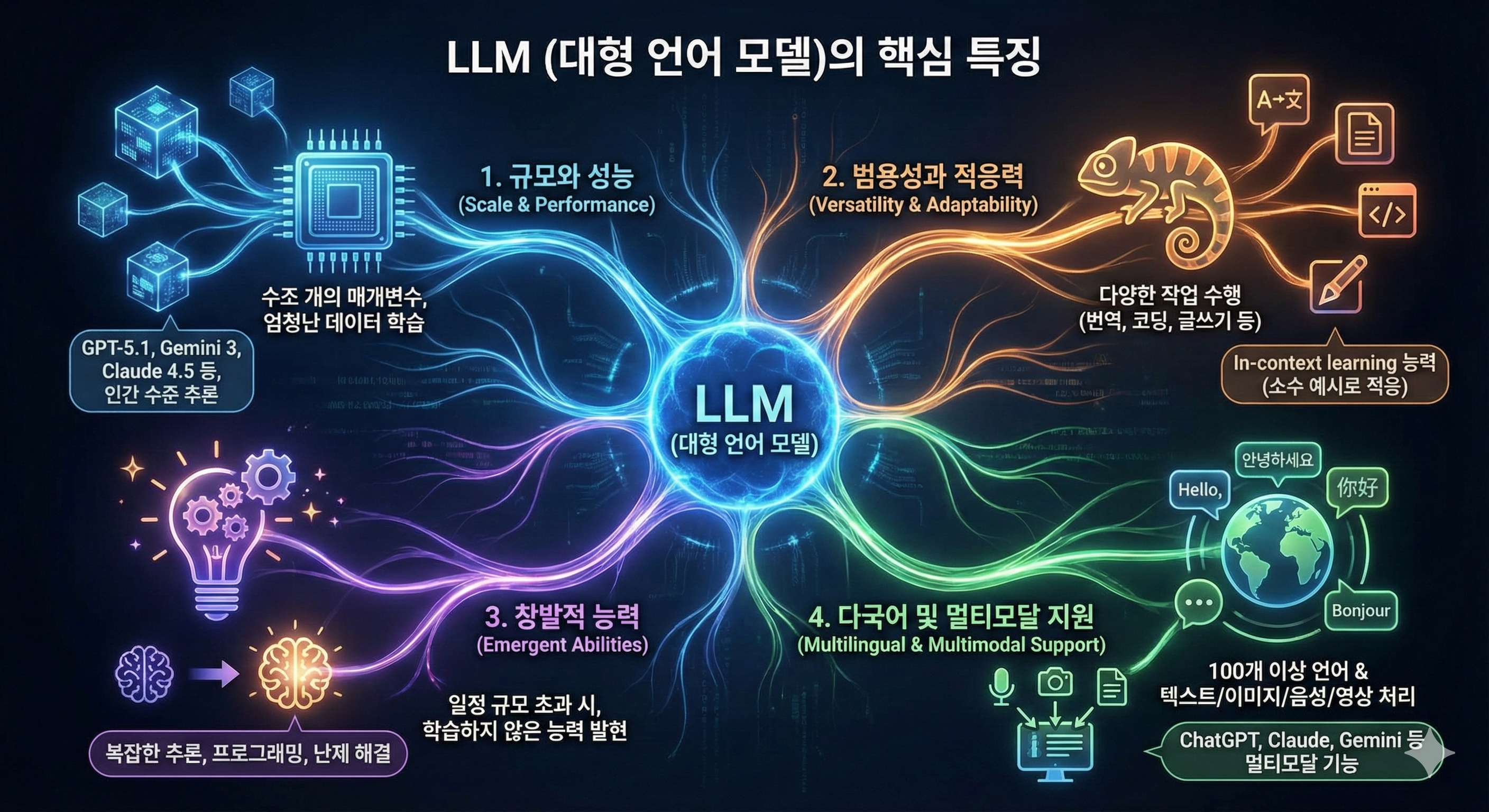 1. 규모와 성능 LLM은 이름에서 알 수 있듯이 '대규모'입니다. 수십억에서 수조 개의 매개변수와 엄청난 양의 데이터로 학습되었습니다. 2025년 현재 GPT-5.1은 수조 개의 파라미터, Gemini 3와 Claude 4.5는 각각 고유한 아키텍처로 인간 수준의 추론 능력을 구현합니다.