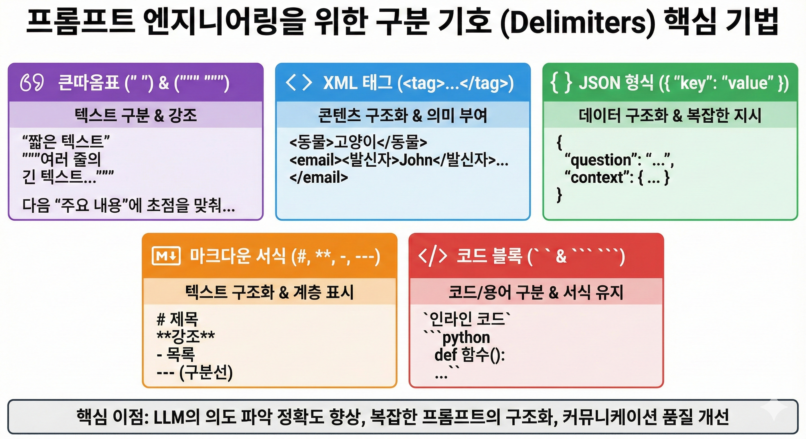 - 프롬프트 내에서 특정 부분을 명확히 구분하여 LLM이 정확히 참조할 수 있게 합니다.