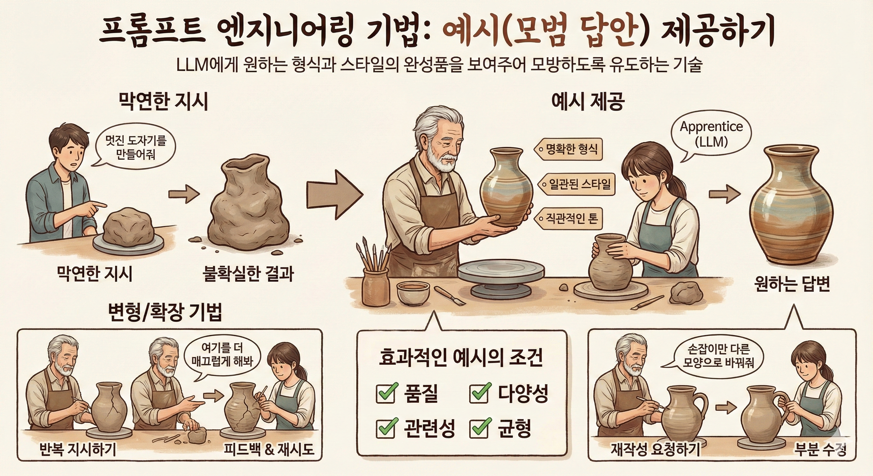 백문이 불여일견이라는 말처럼, 때로는 어떤 구체적인 지시보다 하나 또는 몇 개의 예시가 더 효과적일 수 있습니다. '예시 제공하기'는 LLM에게 원하는 출력 형식이나 스타일을 명확히 전달하는 효과적인 프롬프트 엔지니어링 기법입니다. 이는 LLM이 사용자의 질문에 어떻게 응답해야 하는지 구체적인 예를 통해 보여주고 모방하여 유사한 결과를 생성하도록 유도하는 방법입니다.