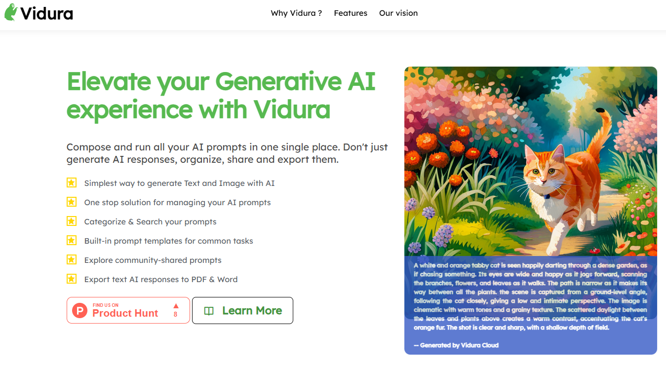 Vidura는 사용자가 텍스트 프롬프트를 작성, 구성, 공유 및 내보낼 수 있게 하는 생성형 AI를 위한 프롬프트 관리자입니다. 새로운 프롬프트를 발견하기 위한 커뮤니티 대시보드와 인기 있는 프롬프트를 추적하기 위한 리더보드를 특징으로 합니다.