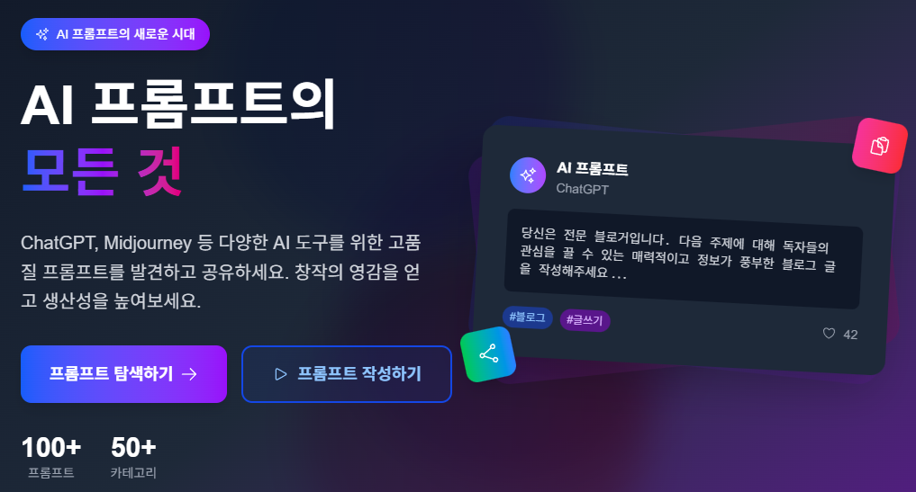 - 국내 최대 프롬프트 라이브러리 중 하나로, ChatGPT부터 Midjourney, Nano Banana까지 다양한 AI 모델을 위한 프롬프트를 제공합니다. AI 활용 가이드와 최신 뉴스도 함께 볼 수 있습니다.