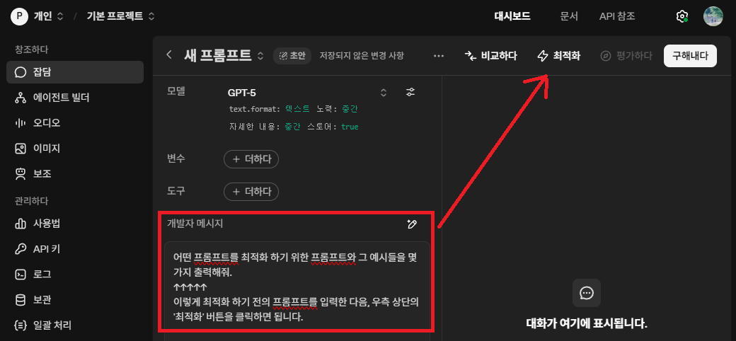 OpenAI 프롬프트 최적화 도구 (🔗: https://platform.openai.com/chat/edit?models=gpt-5)