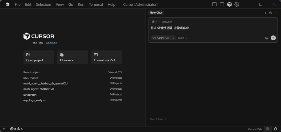 - Agent 모드 : 자율적으로 다중 파일 편집, 터미널 명령 실행, 테스트 코드 작성 등 복잡한 작업 수행