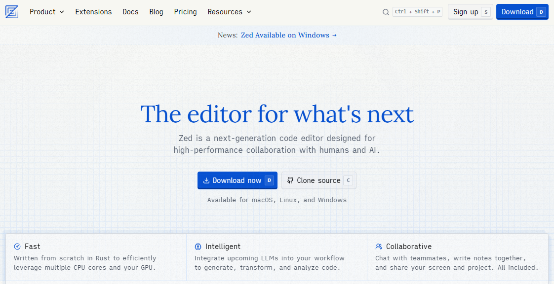 ▶ 개요 : Rust로 작성된 고성능 멀티플레이어 코드 에디터로, 안정적인 AI 기능을 내장하고 있습니다. 기본 수십 가지에서 확장을 통해 백여 개 이상의 다양한 언어를 지원하는 것이 특징입니다.