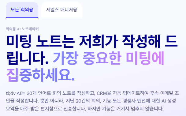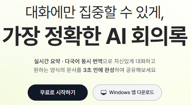 ▶ 개요 : AI 기반 실시간 회의록 작성 서비스로, 0.5초 이내의 초고속 음성 인식과 12개 언어 실시간 번역을 제공하며 대화에만 집중할 수 있게 돕습니다.