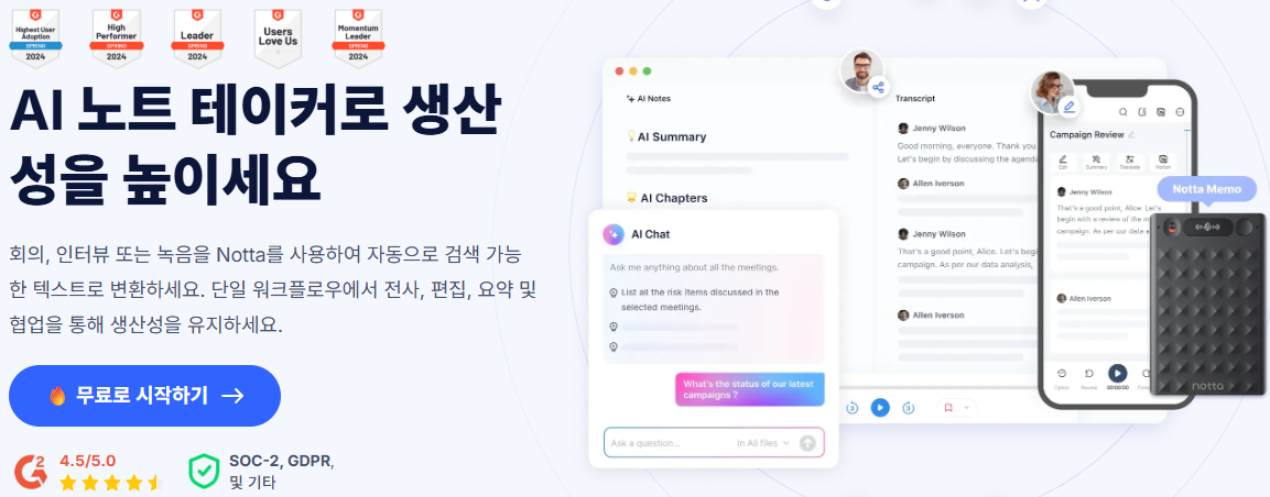 - 화상회의 플랫폼 호환 : Zoom, Google Meet, Microsoft Teams 등 주요 화상회의 도구와 호환되어 회의 내용을 자동으로 기록