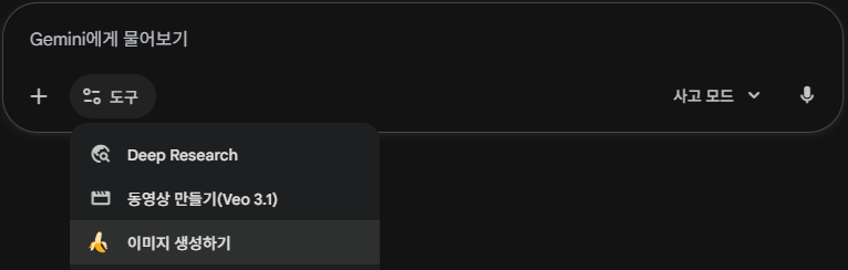 Nano Banana (Gemini) : 대화창 하단에서 '이미지 생성하기' 선택 → 바로가기(외부)