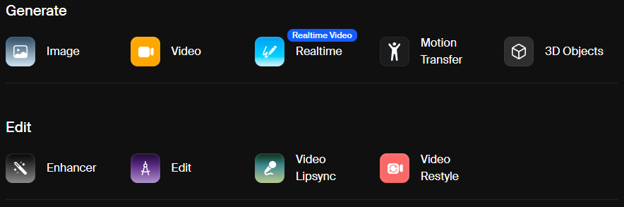 ▶ 개요 : 실시간 AI 이미지 생성 및 편집, 3D 환경 제작을 통합한 종합 크리에이티브 플랫폼입니다. 자체 개발 모델과 다양한 최신 AI 모델을 통합하여 제공합니다.