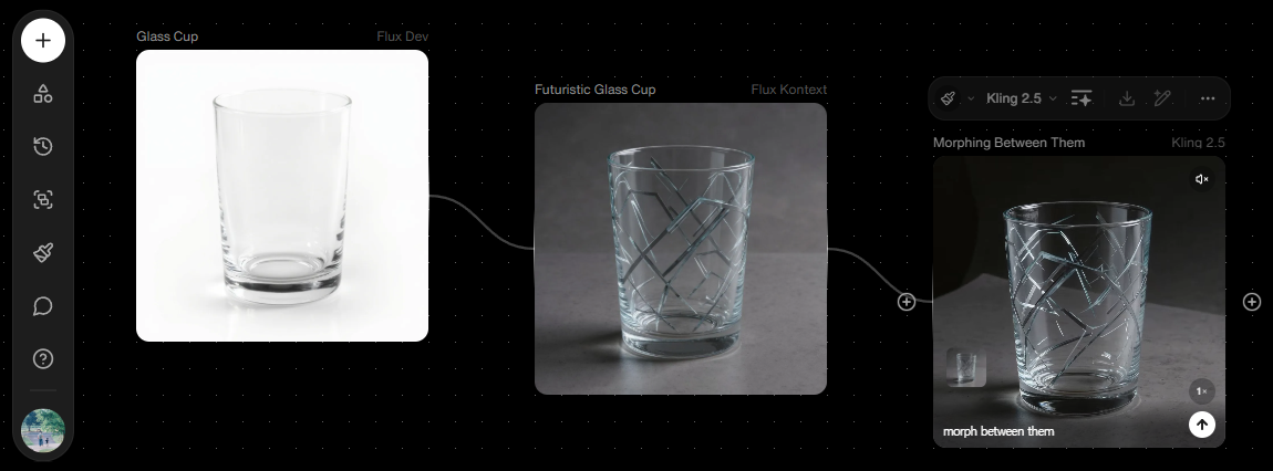 - 노드 기반 워크플로우 : Text, Image, Video 노드를 드래그앤드롭하여 복잡한 AI 작업 체인 구축