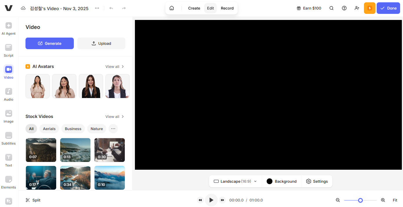 - AI Text-to-Video : 스크립트나 기사 URL을 붙여넣으면 AI가 자동으로 장면, 스톡 미디어, 합성 보이스오버까지 생성