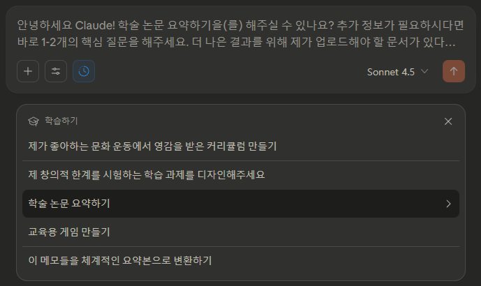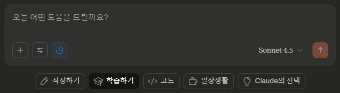 원래 교육용 버전(Claude for Education)에서만 제공되다가 2025년 8월부터 모든 사용자에게 확대되었습니다. 새 대화창 입력부 하단의 '학습하기'를 선택하면 활성화됩니다.