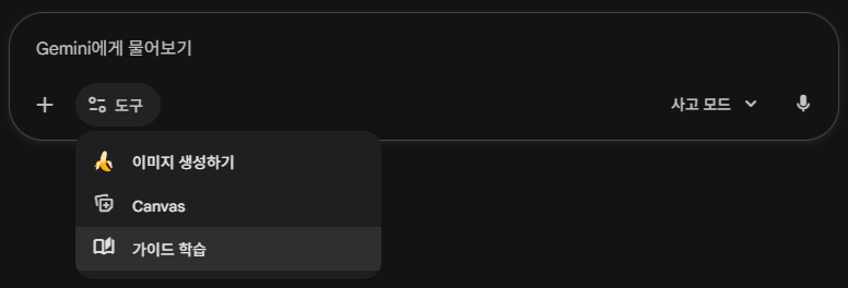 2025년 8월에 도입된 구글의 학습 기능입니다. 구글이 오랜 기간 추진해온 교육 연구를 기반으로 개발한 LearnLM 모델을 활용하며, 프롬프트 입력창 아래 도구 메뉴에서 활성화할 수 있습니다.