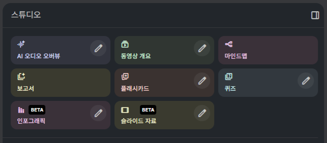 화면 오른쪽의 '스튜디오' 패널에서 다양한 형태의 콘텐츠를 원클릭으로 자동 생성할 수 있습니다. 개정판 작성 시점(2025년 11월) 기준으로 다음과 같은 콘텐츠를 생성 가능하며, 수시로 새로운 기능이 추가되고 있으므로 한 번씩 이용해볼 것을 추천합니다.