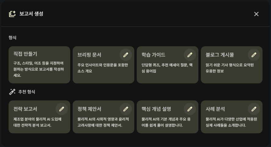 초기부터 제공되던 '브리핑 문서'나 '학습 가이드' 기능은 이제 '보고서' 기능으로 흡수돼 다양한 유형의 텍스트 자료를 만드는 기능으로 개선되었습니다. 현재 노트북에 등록된 소스(들)에 따라 추천 보고서 형식도 다르게 제안합니다.