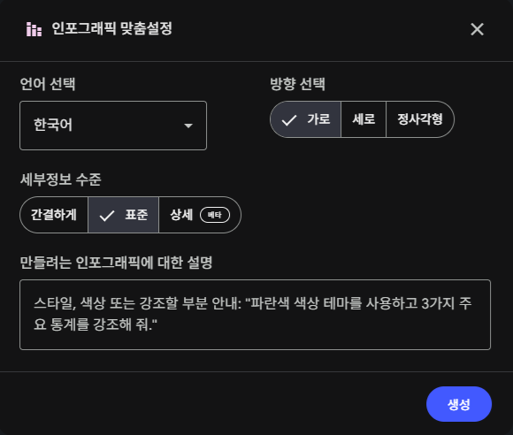 💭 참고로 맞춤설정에서 세부정보 수준이 '상세(베타)' 모드여야 Nano Banana 'Pro' 모델이 쓰이는 것으로 보입니다. '간결하게' 또는 '표준' 모드의 결과 이미지를 보면 텍스트 오류가 좀 더 두드러지는데, 이는 '텍스트 처리(렌더링) 능력'이 Nano Banana 일반 모델(또는 여타 이미지 생성 모델들)과 Nano Banana 'Pro' 모델의 주요 차별점이기 때문입니다.