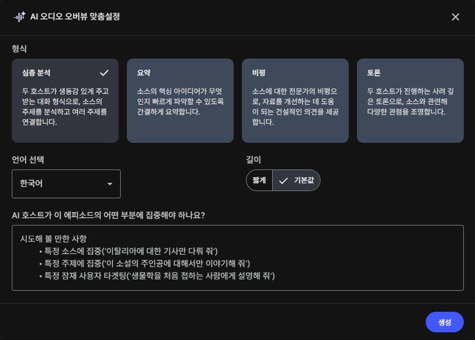특정 주제에 대해 심층 팟캐스트를 만들도록 요청할 수도 있습니다. 기본적으로는 NotebookLM의 AI 오디오 오버뷰 기능이 떠오르지만 '따로 어떤 자료를 찾아 등록할 필요가 없다'는 점이 뚜렷한 차이점입니다. 그저 다음 예시와 같이 사용자가 원하는 주제와 약간의 추가 설명(선택사항)만 등록하고 기다리면 됩니다.