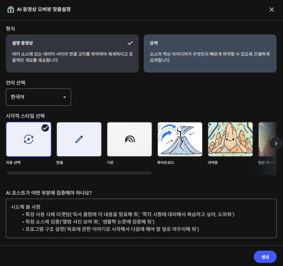 '동영상 개요(Video overview)' 역시 위 오디오 오버뷰와 같은 방식으로 변환할 수 있는데, 그 결과는 오디오 오버뷰에 슬라이드 형식의 이미지를 합친 영상의 형태입니다. 간단한 안내, 설명은 그대로 대체할 수 있을 정도의 품질을 보이고 있으며, 앞으로 '나노 바나나(프로)' 같은 이미지 생성 모델이 합세하면 어디까지 발전할지 기대되는 기능 중 하나입니다.