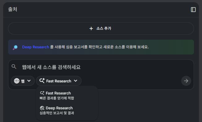 최근에는 NotebookLM에 '소스 검색' 기능이 추가되어, 이제 갖고 있는 자료가 많지 않더라도(심지어 전혀 없더라도!) 검색 기능부터 시작할 수 있게 되었습니다. 소스 패널에서 '웹'을 선택하면 두 가지 검색 모드를 사용할 수 있습니다.