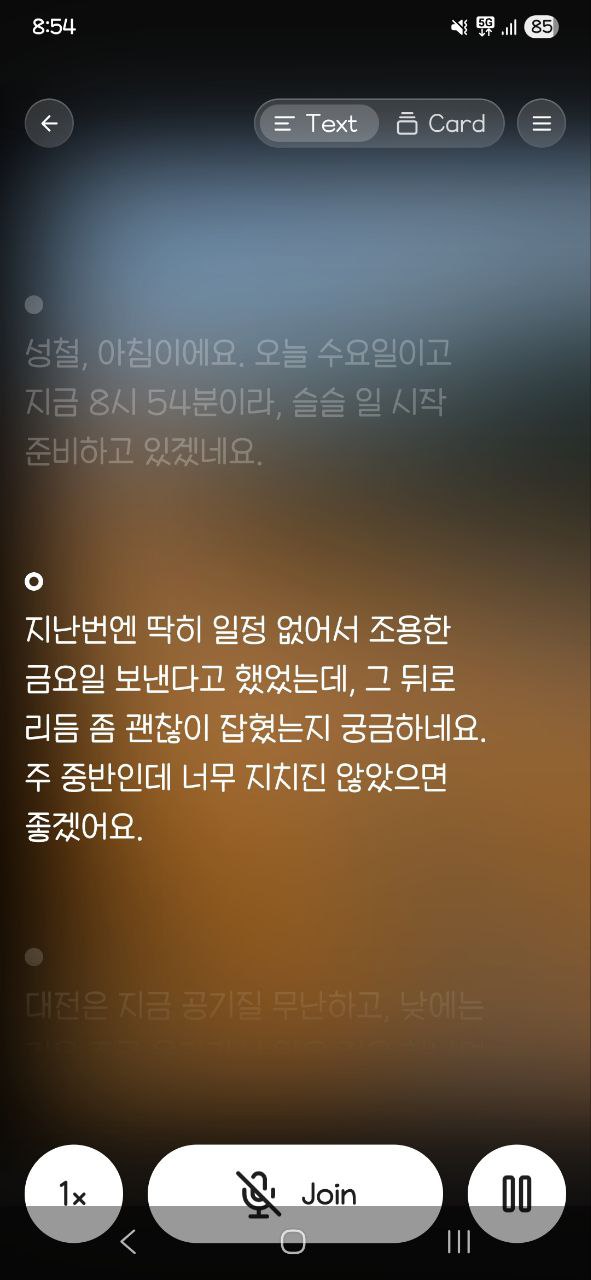 단순한 기계음 낭독이 아니라 짤막한 도입부 오디오와 "오늘은 일정이 많아 바쁘실 것 같네요" 또는 "오늘은 여유가 좀 있겠어요" 같이 맥락을 반영한 오프닝/클로징 멘트도 포함돼 '라디오 방송' 같다는 느낌을 더합니다.