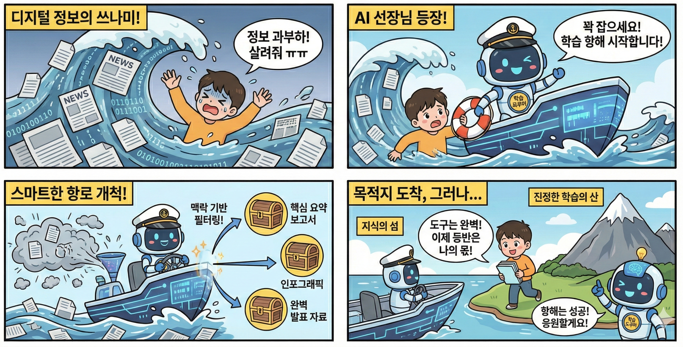 💭 핵심은 조합입니다. 사용자마다 효율적인 학습 방법/패턴이 같을 리 없으므로, 어떤 도구든지 하나만 고집하기보다 학습 단계와 목적에 따라 여러 도구를 적절히 조합하는 것이 가장 효과적입니다. 이 섹션에 언급한 서비스 외에도 4장(생성형 AI 기반 서비스)에서 소개한 여러 도구들을 조합해 자신만의 워크플로우를 찾아가길 권장합니다.